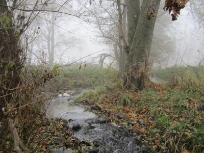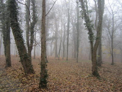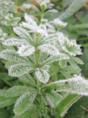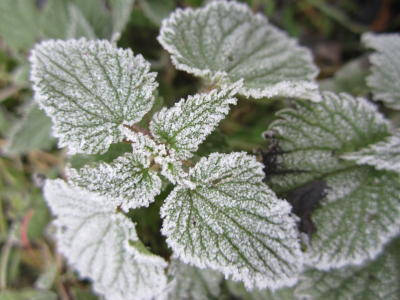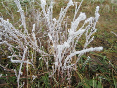 Als Mensch vom Land schreckt mich das nicht im Geringsten und die Eiskristalle sind wirklich wunderschön. Nach intensiven Internetrecherchen ist klar, dass auch nicht so bald ein Bus fährt. Also was macht der unerschrockene Deutsche? Richtig, er läuft. Bei Nebel und minus 2 Grad, 4,5 Kilometer in den nächsten Ort. Bewaffnet nur mit dem Lebenswichtigsten (Digicam, Handy, Gewerbeantrag und ein Würstchen auf die Faust), ziehe ich mir noch meine Inkognitokleidung an. Soll bedeuten, heute weder grüner Mantel noch rosa Schal, sondern einen langen schwarzen Mantel und die Kapuze tief ins Gesicht gezogen. Damit sehe ich aus wie Kenny aus South Park und niemand erkennt mich auf den ersten Blick. Und so laufe ich durch den Nebel über Felder, an Bäumen und Büschen vorbei, springe nicht ganz so trockenen Fußes über einen Bach, fühle mich wirklich großartig dabei und nebenher fotografiere ich alle möglichen Pflanzen, die so verzaubert aussehen durch das Eis. Die Geräusche der Straße kommen nur gedämpft bei mir an und da ich ja ganz allein bin, singe ich lauthals alle Popsongs, die mir in den Sinn kommen. Der perfekte Augenblick! Ein Stück des Weges renne ich und in meinem Übermut drehe ich mich singend ein paarmal mit ausgebreiteten Armen um mich selbst - als ein älterer Herr mit Hund vor mir steht. Weiß der Himmel, wo der so plötzlich hergekommen ist, so mitten auf dem Acker. Etwas irritiert geht er leise grüßend an mir vorbei, um dann sofort in ein, wie ich finde, für sein Alter beachtliches Tempo zu verfallen. Wahrscheinlich ist die Verrückte vom Feld DAS Thema bei der nächsten Familienfeier. Aber Dank Inkognitomantel alles kein Problem.